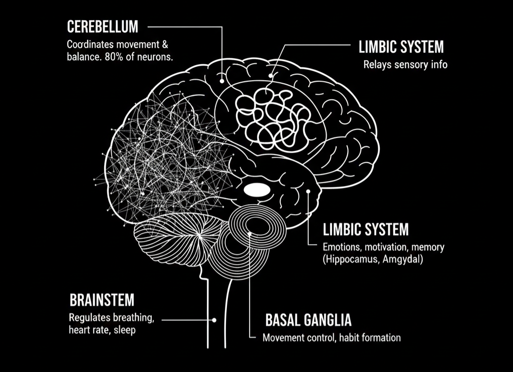 The cerebellum helps coordinate movement and balance (interestingly, it contains even more neurons than the cortex, although of a different kind). The brainstem regulates vital functions like breathing, heart rate, and sleep. The limbic system, including the hippocampus and amygdala, manages emotions, motivation, and memory. The basal ganglia help control movement and habit formation. The thalamus relays sensory information; the hypothalamus regulates hunger, temperature, and hormones.