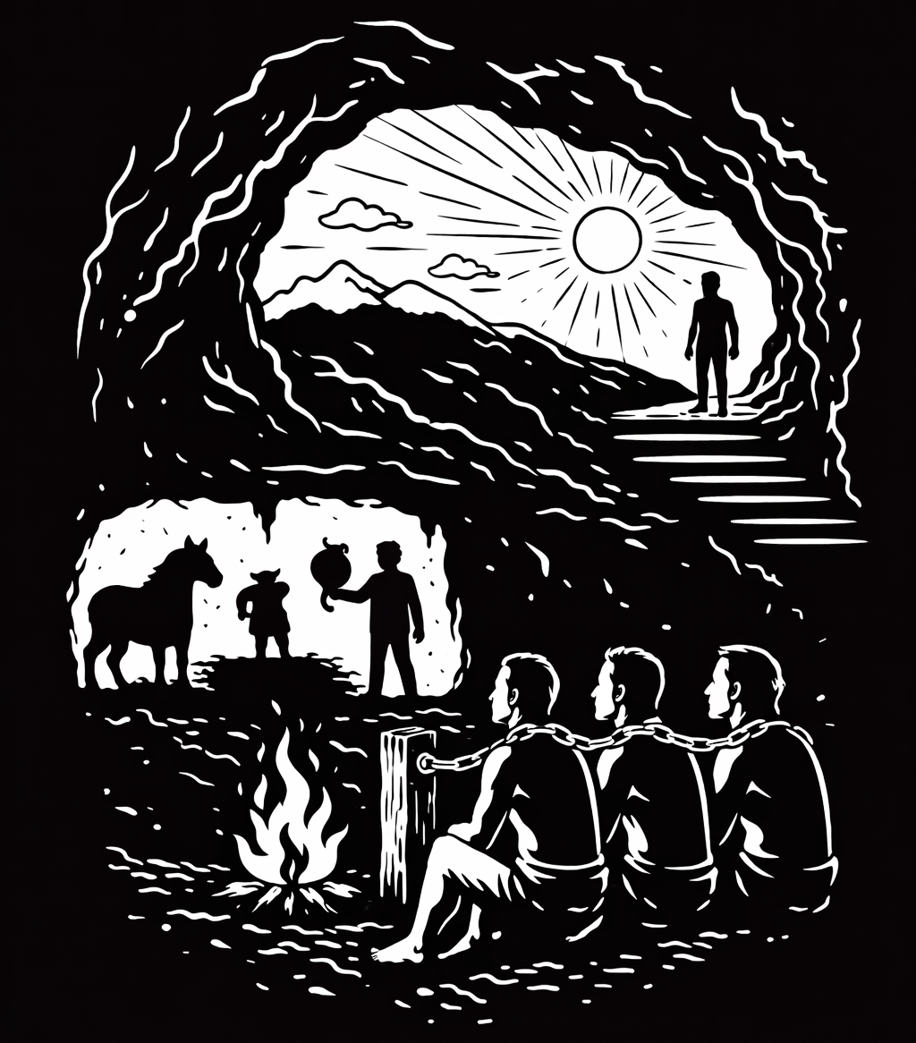 Plato’s allegory of the cave describes a group of prisoners who have been chained inside a cave since birth. They cannot turn their heads. All they see are shadows cast on a wall in front of them, projected by objects passing in front of a fire behind them. The shadows are all they know. They name them, argue about them, take them seriously.